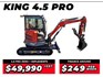 The Digger King 4.5 Ton Pro Zero Excavator with Enclosed Cab, Reverse Cycle Air Con, Zero Turn and Pro Package Options Starting at just $49,990 + GST or around $249 per week on finance, scroll down for all inclusions and package options Are you looking for a new, reliable, super heavy duty excavator for sale with a premium Kubota 3 cylinder engine? The 4.5 ton Pro Zero not only comes with Digger King's Pro Package, but has swing boom and zero turn to make this machine a wonder to spend the day in! Standard Package Inclusions: Enclosed cab with reverse cycle air con 3 cylinder Kubota Engine Swing Boom Zero Turn 200mm Trenching Bucket 500mm Batter Bucket 800mm Mud Bucket Hydraulic Thumb Hydraulic Quick Hitch 12 month parts and labour, 36 month parts warranty Premium Package Includes Everything In The Standard Package Plus: 1000mm Bucket Ripper Rake 360 Degree Rotating Hydraulic Grab 4.5 Ton Pro Zero Excavator and Implements Package Inclusions: Swing Boom and Zero Turn - making this machine easy to manage and convenient to work in Enclosed cab with reverse cycle air con - ultimate comfort to work in Easy to apply, no deposit and financing available- The Digger King 4.5 from just $249 per week, all done via experienced finance teams that search for the best deal for you. From the first day you own your new digger, no dodgy overpriced rent-to-own options Able to dig down to 3265mm - this means most trenches will be dug with ease Large deep grip tracks- this allows you to grip in the most sticky situations Small Operating area - this allows you to access areas easily Easy to use controls - this means it is simple to operate 3670mm maximum dumping height - means you can load trucks or pile things up higher and easier Easy to operate and accessible controls - Operate your King 4.5 in comfort Reliable and strong - your King 4.5 ton is built strong, as strong as bigger brand name diggers but without the price tag 3-minute on pre start check - yes, simple and easy to access, walk around, check oil, water and attachments in 3 minutes or less King comfy seat - this gives you comfort when operating all day Easy clean floor - getting mud off the floor is easy, clean with no hassles Quick release bucket - adds to the speed, if you need to remove the bucket it is fast, easy with no fuss Adjustable level blade - you can adjust and level out ground in front of you All round vision - nice and handy to see around you when backing up High grip handles - walk in and out easily with a high grip handle within easy access; this means even on rough ground you can get back on board with no issues 12 month parts and labour, 36-month parts warranty - Your investment is safe and secure. If you have any dramas with workmanship on your digger or anything in your digger, let us know and we will sort it out as quickly as we can Dedicated after-sales help and support - 1300 direct line to our help staff. Got a question? We are happy to help Easy add-on equipment - Select from our range, we will fit it to your digger for you or supply your own and you can fit it when your digger arrives Engine Engine Make Kubota Fuel Type Diesel Rated Power 30 hp Electrical 12 Volt Hydraulic System Pump Brand Hengli (German Design) Valve Brand Hengli (German Design) Pressure 22 Mpa PSI ( 220Bar) Flow 99L/Min Cooler Air Driving System Motor Brand Eddie (Italian Design) Pressure 21 Mpa (210 Bar) Flow L/Min Speed Km/h Fluid Capacities Fuel 60L Diesel Hydraulic Oil 50L Engine Oil 7L Load Capacity - 600 kg Weight - 4300 kg Width - 1700 mm Boom - Swing Dimensions - 5054 mm (L) x 1740 mm (W) x 2555 mm (H) Warranty - 12 months parts and labour, 36 month parts warranty