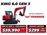 2025 DIGGER KING 6.0T GEN 3 Enclosed cab with reverse cycle air con - ultimate comfort to work in Easy to apply, no deposit and financing available- The Digger King 6.0 from just $299 per week, all done via experienced finance teams that search for the best deal for you. From the first day you own your new digger, no dodgy overpriced rent-to-own options Able to dig down to 3800mm - this means most trenches will be dug with ease Large deep grip tracks- this allows you to grip in the most sticky situations Small Operating area - this allows you to access areas easily Easy to use controls - this means it is simple to operate 4110mm maximum dumping height - means you can load trucks or pile things up higher and easier Easy to operate and accessible controls - Operate your King 6.0 in comfort Reliable and strong - your King 6.0 ton is built strong, as strong as bigger brand name diggers but without the price tag 3-minute on pre start check - yes, simple and easy to access, walk around, check oil, water and attachments in 3 minutes or less King comfy seat - this gives you comfort when operating all day Easy clean floor - getting mud off the floor is easy, clean with no hassles Quick release bucket - adds to the speed, if you need to remove the bucket it is fast, easy with no fuss Adjustable level blade - you can adjust and level out ground in front of you All round vision - nice and handy to see around you when backing up High grip handles - walk in and out easily with a high grip handle within easy access; this means even on rough ground you can get back on board with no issues 12 month parts and labour, 36-month parts warranty - Your investment is safe and secure. If you have any dramas with workmanship on your digger or anything in your digger, let us know and we will sort it out as quickly as we can Dedicated after-sales help and support - 1300 direct line to our help staff. Got a question? We are happy to help Easy add-on equipment - Select from our range, we will fit it to your digger for you or supply your own and you can fit it when your digger arrives Eddie Hydraulics system Eddie Drive system Load Capacity - 860 kg Weight - 6000 kg Width - 1880 mm Dimensions - 5850 mm (L) x 1880 mm (W) x 2590 mm (H) Warranty - 12 months parts and labour, 36 month parts warranty